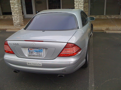 This beautiful Mercedes Benz CL500 was parked in Austin, Texas -- on a parking stripe, basically taking up 2 spaces. The after-market black wheels and tires were sharp and expensive. The lone bumper sticker read: Jesus, I trust in You.